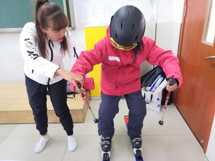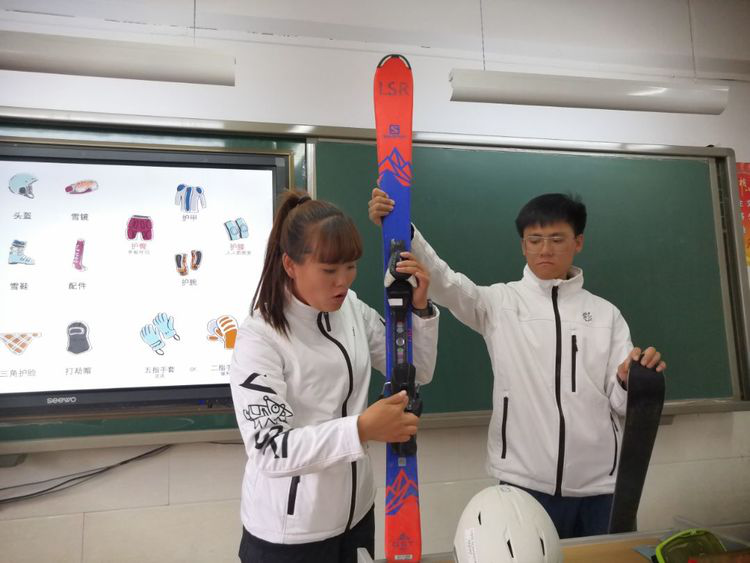 躍躍欲試的同學們在冰雪講師的指導下親身體驗滑雪裝備的魅力,興奮不已。